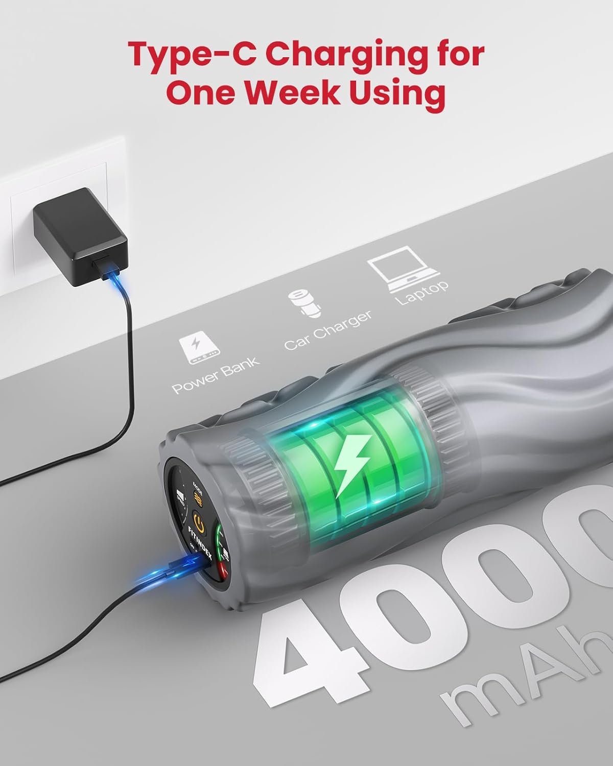 Answer 2: The foam roller features a built-in USB-C port for easy charging, taking just five hours to fully charge. Once charged, it offers over two hours of uninterrupted use on the highest intensity setting.